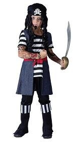 Description : Il costume da pirata comprende: maniche tatuate. Camicia, gilet con cintura. Pantaloni con copri stivali. Copricapo. Taglia Medium (122 - 134 cm)